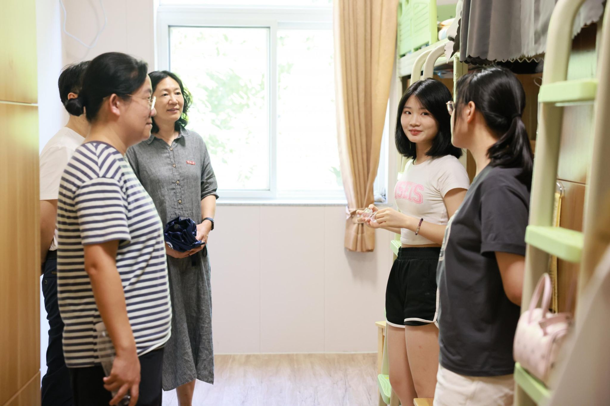 党委书记霍妍、党委副书记姜萍、副院长徐松、副院长李莉、工会主席李茂华及新生班主任、辅导员一行走进新生宿舍,与同学们“拉家常、聊近况、话学业”,送上来自成人影视片