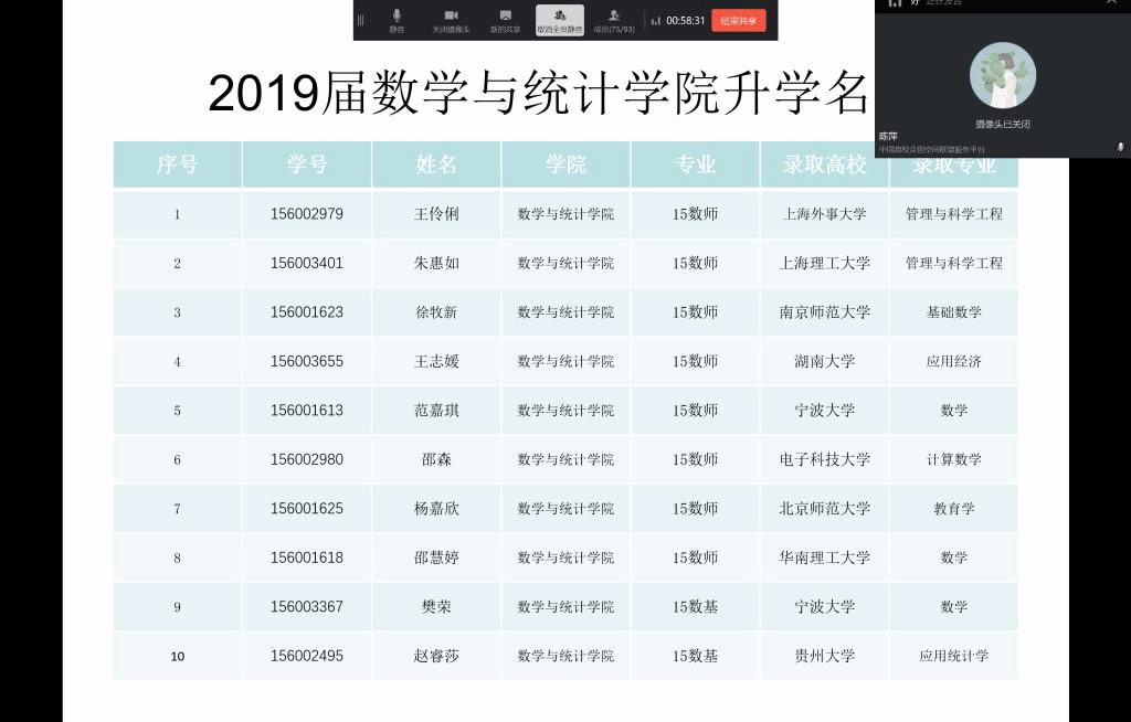 本次动员大会开始学工办冯程老师简单介绍了近三年的考研情况。接着胡良根老师开始宣讲,他有丰富的考研指导经验,曾指导2017届数学与应用数学基地班(46人)考研率突破50%。胡老师主要讲从目前考研形势、院校选择和具体备考策略为17级考研学生分享了宝贵的经验。随后,2017级班主任代表蒋侃、蒋先江、李建峰老师分别从找一个考研搭档,如何让做好规划,如何选择好国内国外两种升学方式做了考研动员宣讲。此次考研动员大会还特别邀请了17届考入中山大学的王若宁、18届考入湖南大学的申旭彤和19届考入电子科技大学的邵森三位优秀考研学长学姐“以身说法”分享了自己的考研备考经验。最后的线上交流环节2021届考研备考学子互动热烈。