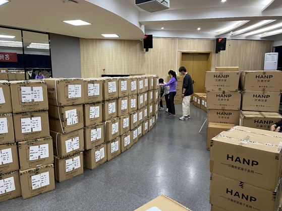 在物资到达的当晚,学院党委副书记姜萍和院办老师孙玮悦带领正在学院自习室学习的研究生们接收物资并完成清点。4月21日下午,孙老师按照实际在校人员进行名单整理,研究生万磊、王高磊等学生志愿者根据名单按照班级分装物资。分装完毕以后,随即立刻通知班级代表前来领取,保证在当天晚上将所有物资发放到每个同学的手上。鉴于疫情防控需要,目前专任教师们暂时还不能返校,学院院办将老师们的物资清点完毕并已经妥善保管,等待老师们可以返校之后再来领取。