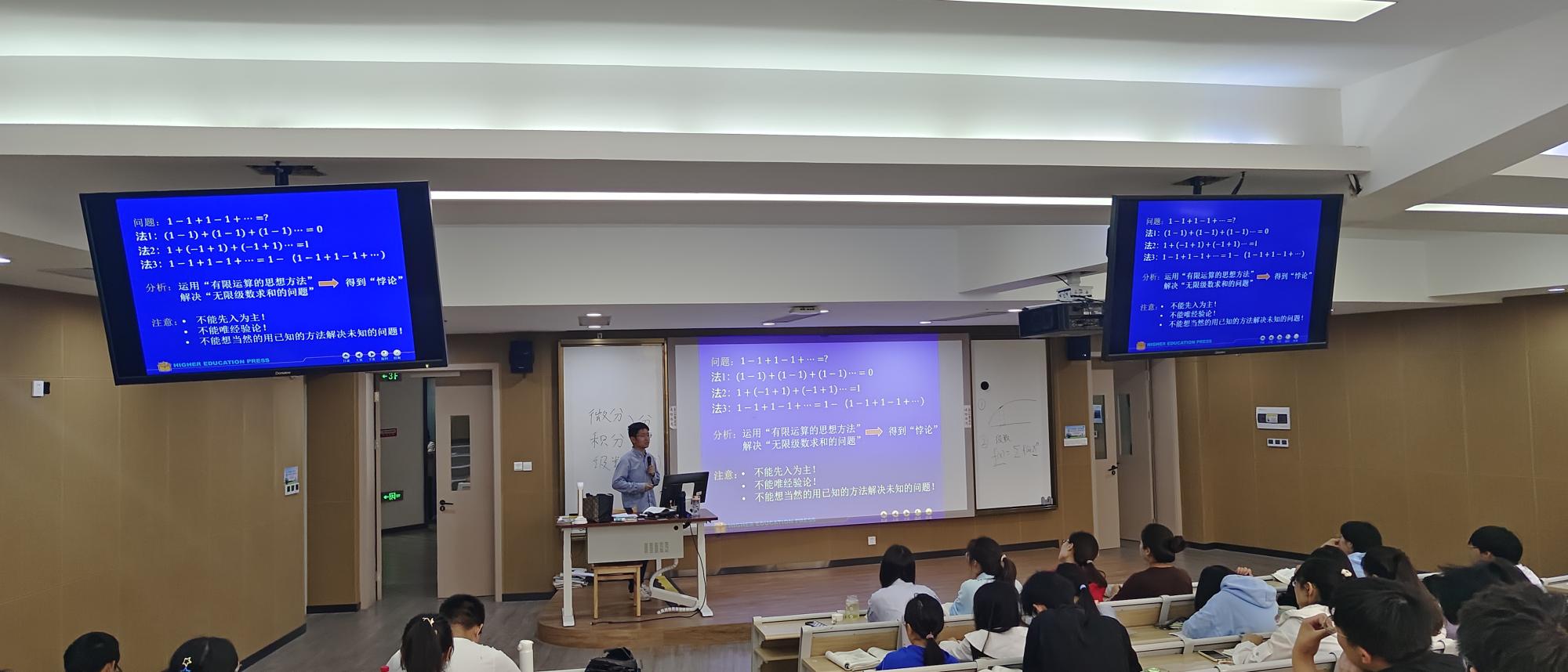 李老师以《庄子·天下篇》中记载的“一尺之棰,日取其半,万世不竭”等中国古代哲学思想为切入点引出“无穷级数”的概念。通过级数概念和性质的讲解,让学生深刻体会我国古代数学的发展成就,增强学生文化自信;同时,结合“蜗牛爬绳”的故事引出调和级数这一重要数学概念,并以此引导学生深刻理解习总书记的叮嘱“每个人的生活都是由一件件小事组成的,养小善才能成大德”。