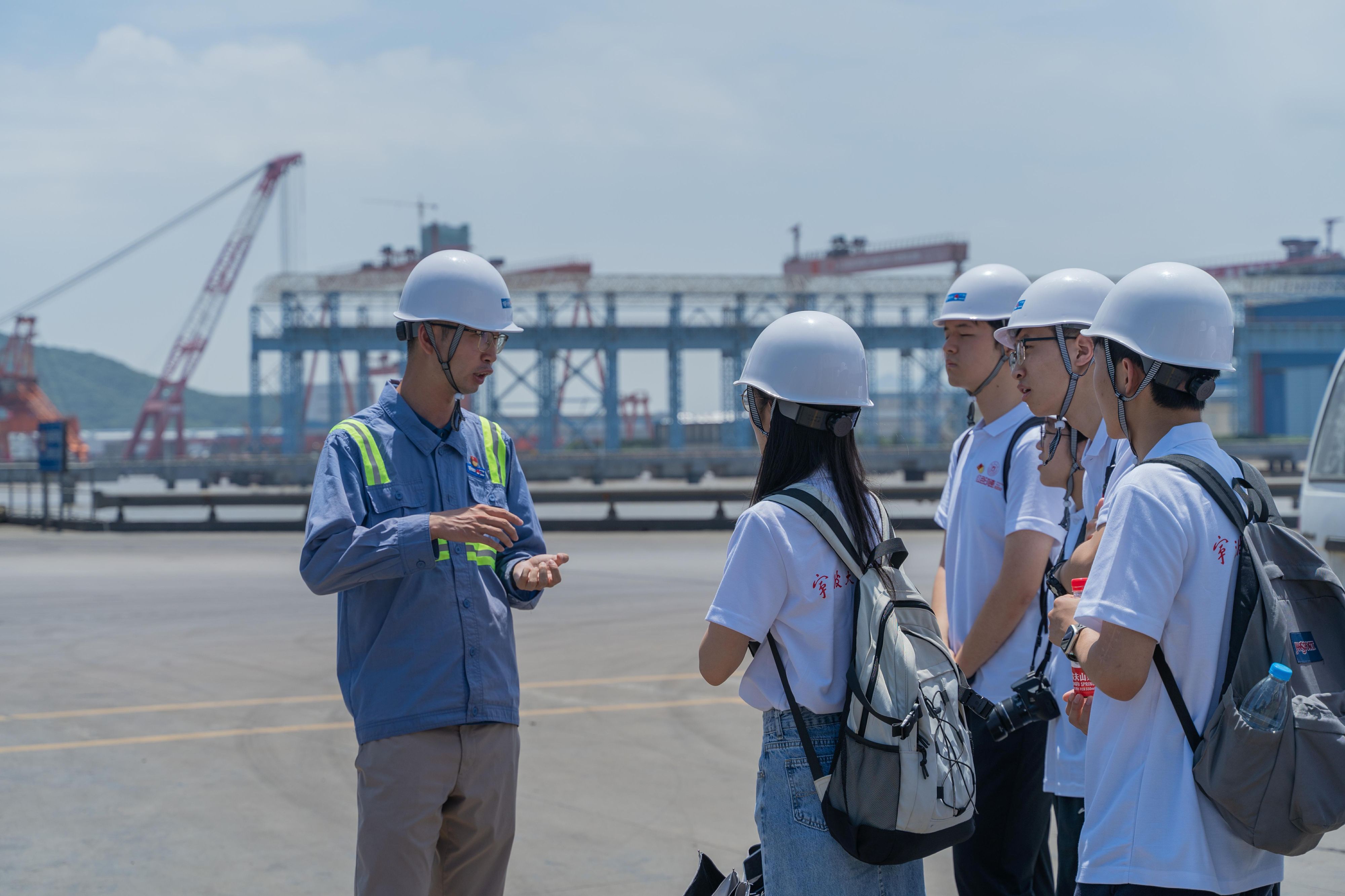 校友李佳骏的陪同下前往码头进行近距离参观,在切身领略港口规模及设施运行后,李佳骏校友向大家介绍了舟山港近些年来遇到的挑战,让大家深刻感受到舟山港的飞速发展离不开习总书记的谋篇布局,离不开舟山港工作人员们肯吃苦、肯奋斗的时代精神。