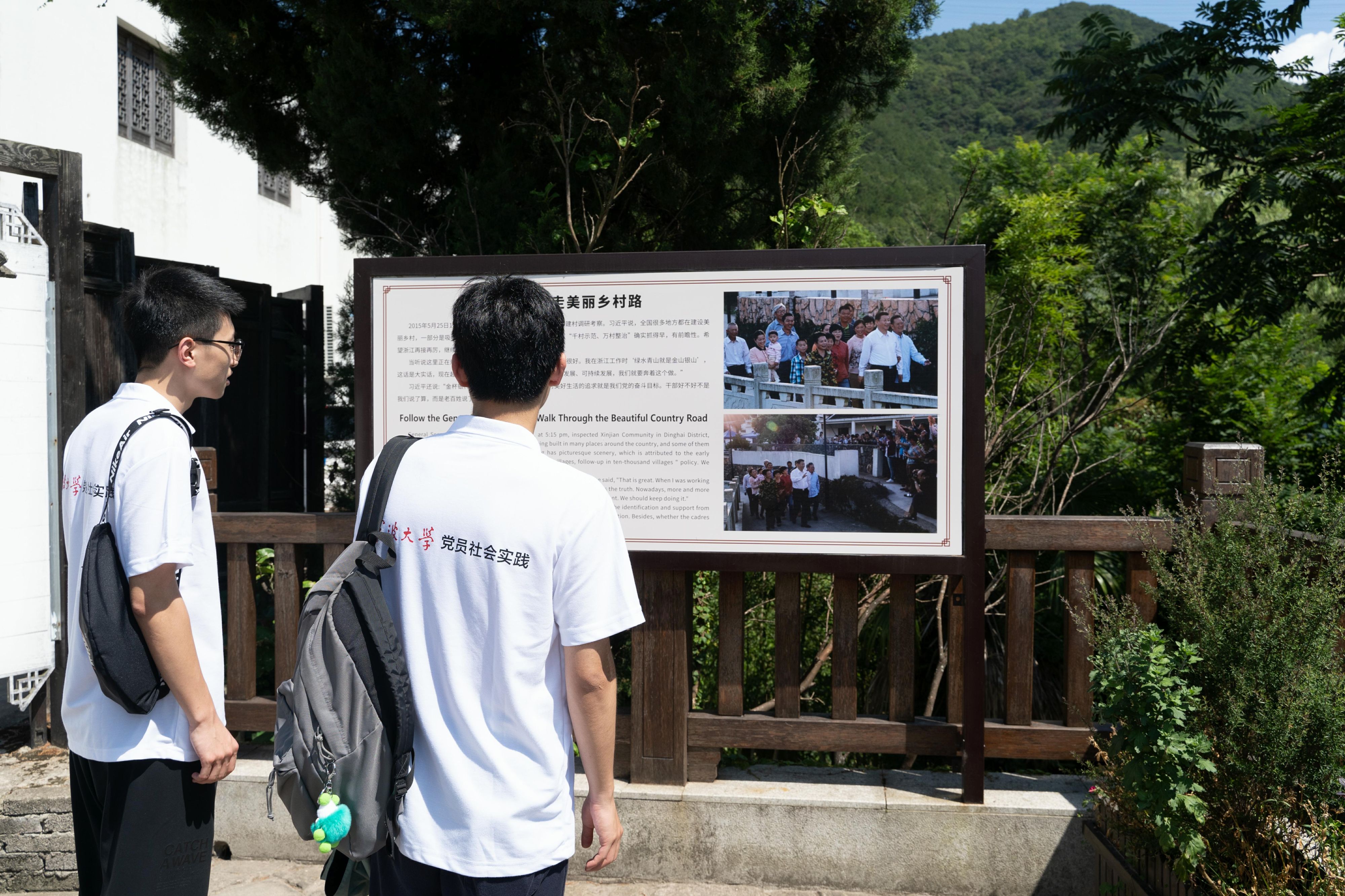 “红色溯源行动”实践小分队围绕“循迹溯源学思想促践行”主题,寻找总书记牵挂于心的在海岛乡村—舟山定海新建社区。行走在三面环山、溪谷蜿蜒的乡村小道里,耳边回响的是总书记在新建村调研时所说的,“这里是一个天然大氧吧,是‘美丽经济’,印证了绿水青山就是金山银山的道理。”