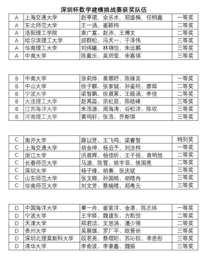 “深圳杯”数学建模挑战赛(原名为:全国大学生数学建模夏令营)是全国大学生数学建模竞赛活动的延伸,由全国大学生数学建模竞赛组委会组织,不同于竞赛,其题目的规模和难度都比较大,共分为ABCD四道赛题,每题设有一等奖一名,二等奖两名,三等奖三名。本项赛事旨在促进用数学方法和计算机技术结合,解决实际问题,激发广大学生对数学与科技的兴趣。比赛吸引了来自全国各地的众多高校和科研机构的学生团队以及俄罗斯队伍参与,历时四个月,有来自包括清华大学、中国科学技术大学、浙江大学、上海交通大学等全国40多所高校68支队伍近200名优秀学生进入决赛。