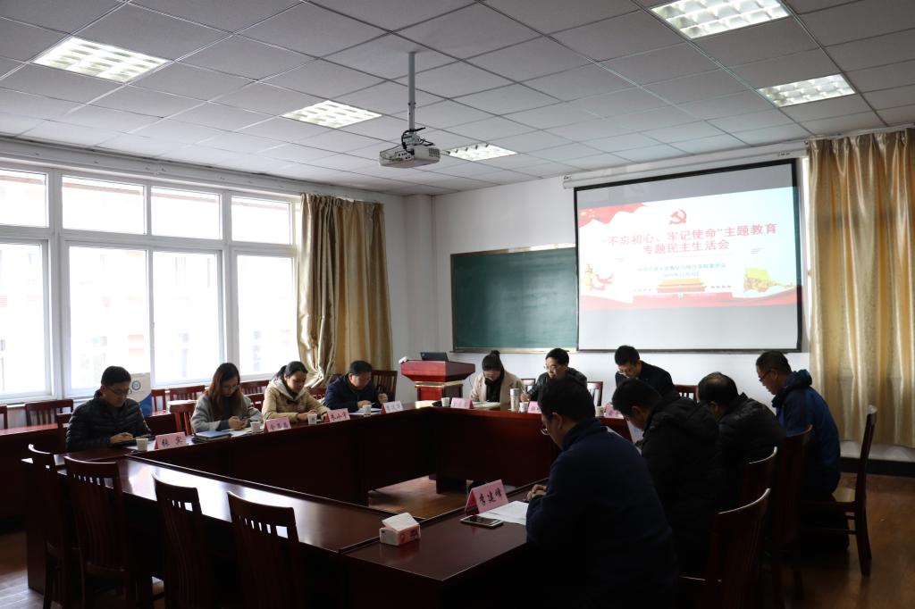 12月9日,数学与统计学院党委班子在9号楼303会议室召开“不忘初心、牢记使命”专题民主生活会。会议由党委书记俞金波主持,学校第二巡回指导组副组长骆明伟,组员金芬芬参加。民主党派代表李茂华、青年博士代表朱小宇列席会议。会议紧扣学习贯彻习近平新时代中国特色社会主义思想主线,聚焦“不忘初心、牢记使命”主题,班子和班子成员分别对照问题检视开展严肃认真的批评和自我批评。