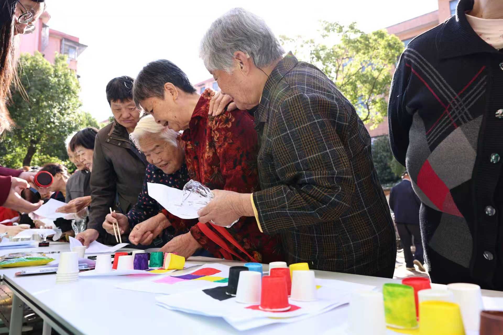 运动区气氛尤为热烈。“吹乒乓球过杯”、“双人运纸同行”、“筷子夹棋”、“绕瓶稳健走”等趣味项目逐一展开。老人们成对配合,夹纸前行时从容不迫,夹棋子时稳准兼备,吹乒乓球时气定神闲。每当一组老人完成挑战,小“数”苗志愿者们便会递上精心准备的手工礼物和手写贺卡,将温暖传递至心田。