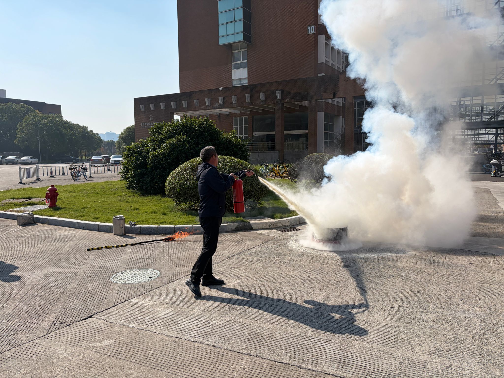 随着警报的拉响和烟雾的弥漫,师生们临危不乱,迅速用衣物或手帕严实掩住口鼻,压低身体,沿着疏散指示标志快速而有序地从楼梯撤离,最终安全抵达楼外的空旷集合点。待全体人员集结完毕,演习进入灭火实操环节。主讲人将看似复杂的灭火器操作规程,精辟提炼为“提、拔、握、压”四字真诀。随着他清晰有力的示范讲解,原本冰冷的钢铁器械,此刻在师生眼中,仿佛幻化成握在手中、守护生命的可靠盾牌。