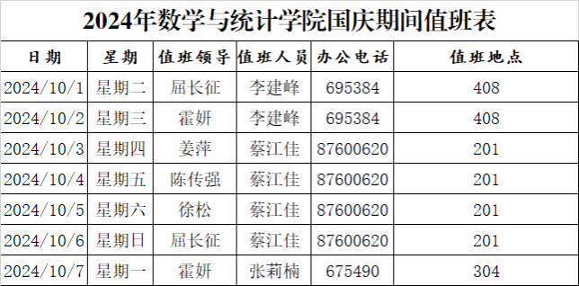 根据学校《关于2024年中秋节、国庆节放假安排的通知》的要求,国庆节放假期间要求做好值班值守工作。放假期间,二级学院须安排1名值班人员在校值班。值班时间为每天8:30-16:00。成人影视片