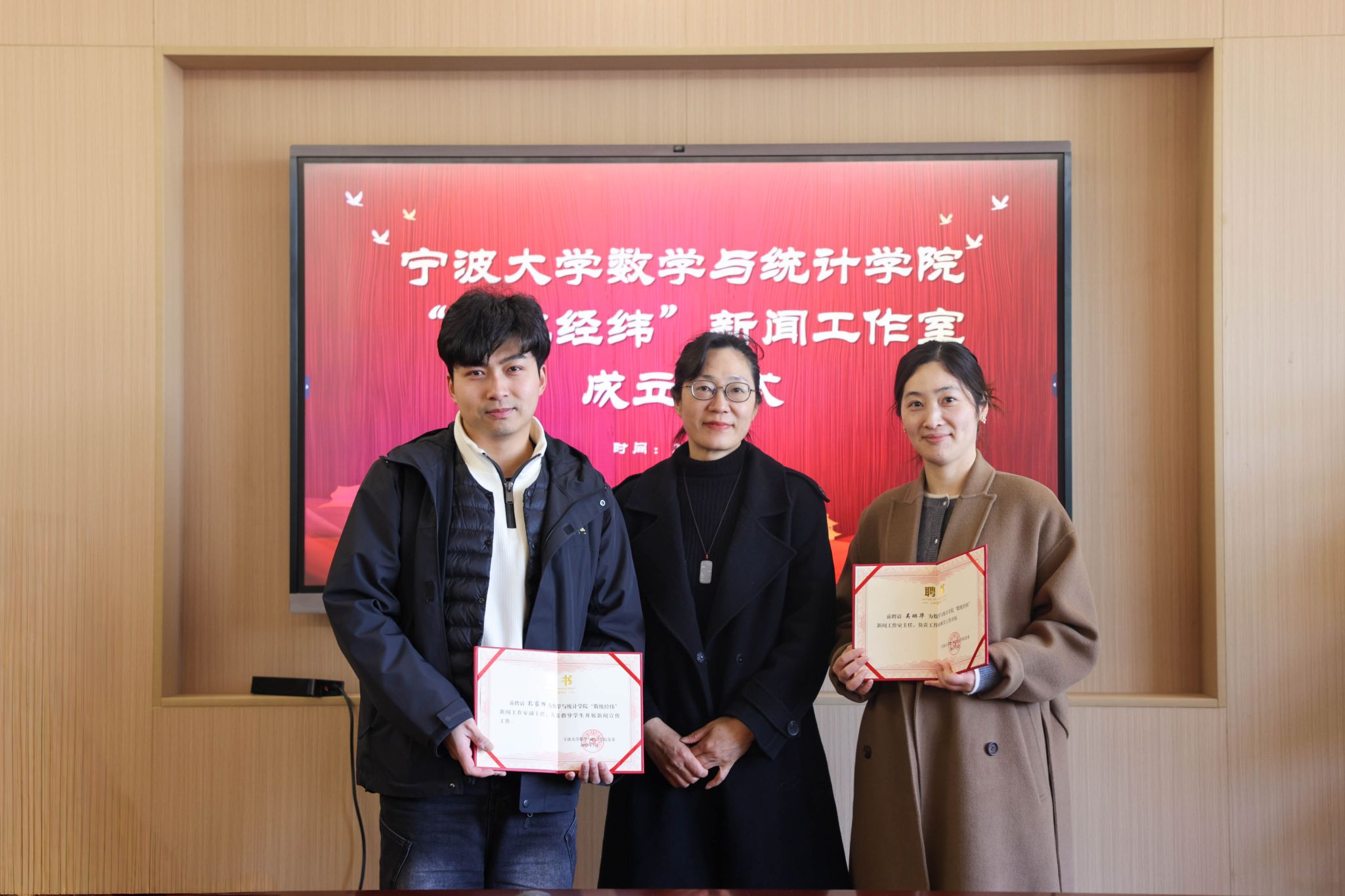 “数统经纬”新闻工作室正式成立,并举行了聘任仪式。仪式由学院党委副书记主持,学院党委书记出席并发表讲话,学院党委委员、学工办主任、分管委书记、工作室成员及各学生社团组织宣传骨干共同见证了这一重要时刻。