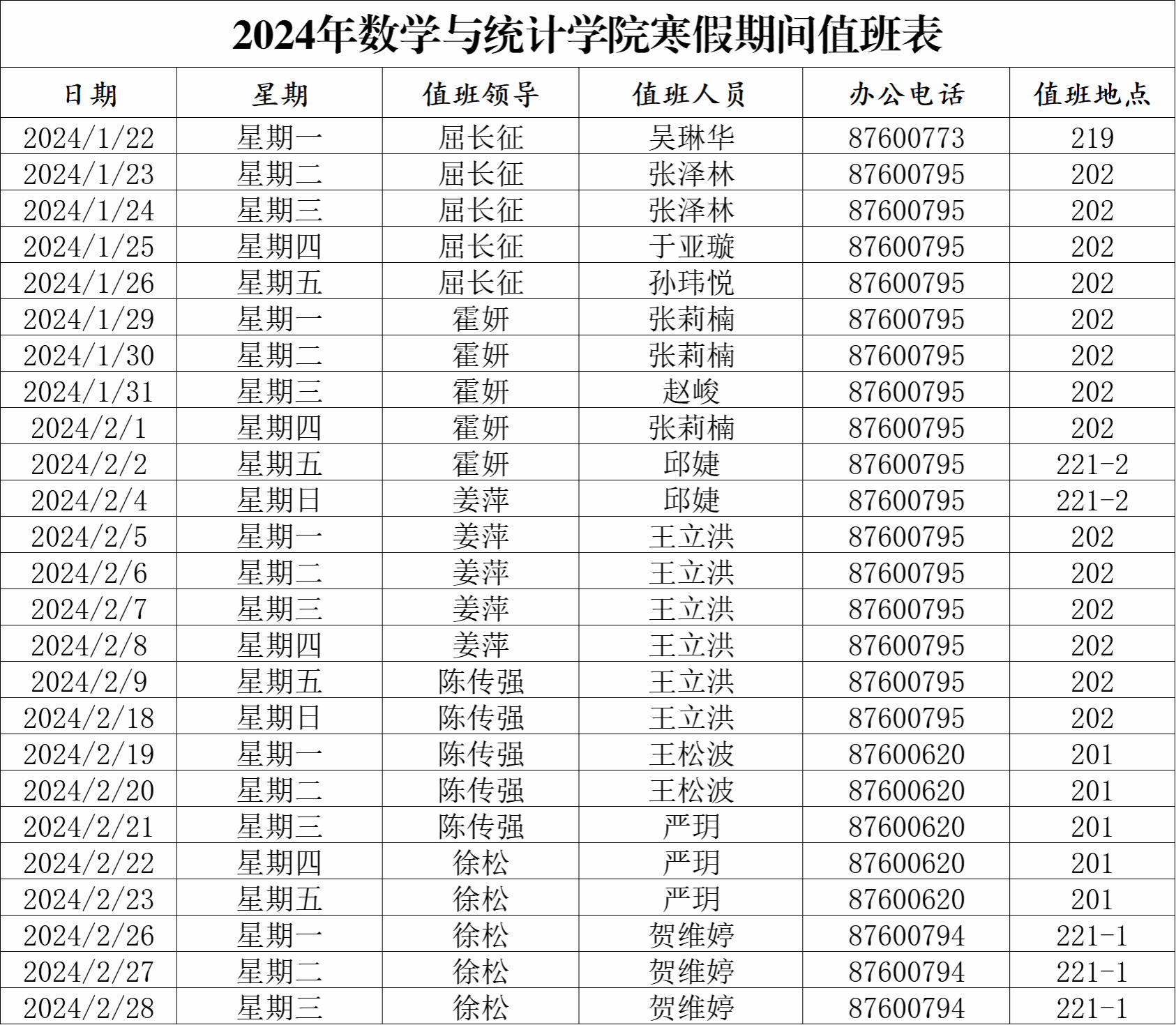 按照《成人影视片 校长办公室关于2024年寒假和假期值班工作安排的通知》中的安排,要根据“不误办事”的原则,安排好假期值班人员,确保工作日(农历正月初一至初八除外)有专人值班,值班时间为每天8:30-16:00。成人影视片 2024年寒假值班安排如下:
