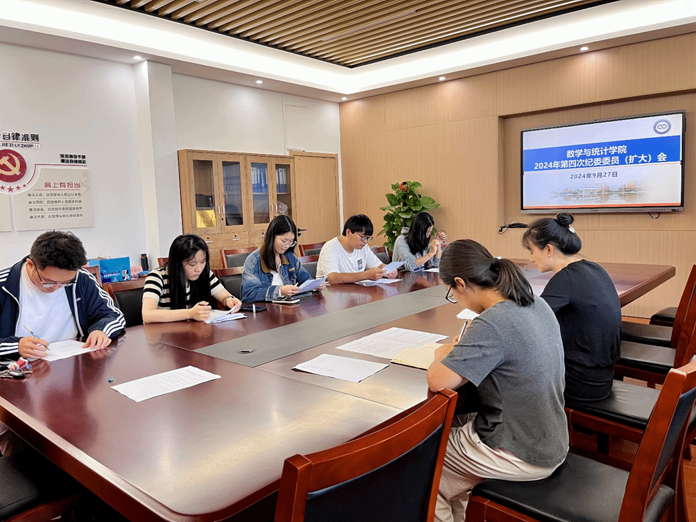 9月27日,数学与统计学院纪委在学院218会议室召开2024年第4次纪委工作例会,会议由院党委副书记、纪委书记姜萍主持,学院纪委委员、学生党支部纪检委员参加会议。